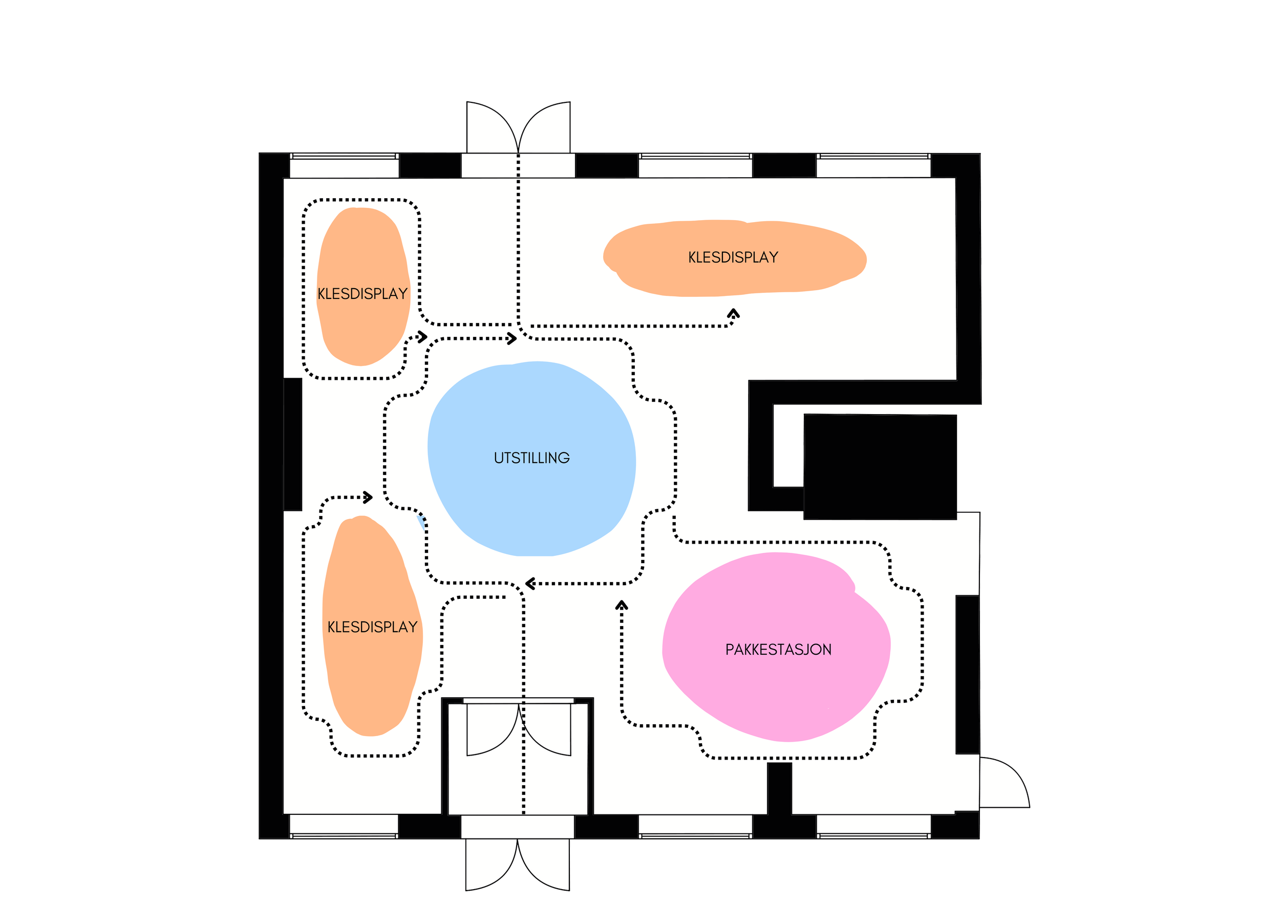 På grunn av lokalet jeg valgte bestemte jeg meg for å gå for en “loop” butikk layout. Denne typen layout på en butikk fremmer salg og gir varene mer eksponering, samtidig som de ansatte har full oversikt over det som foregår i butikken.